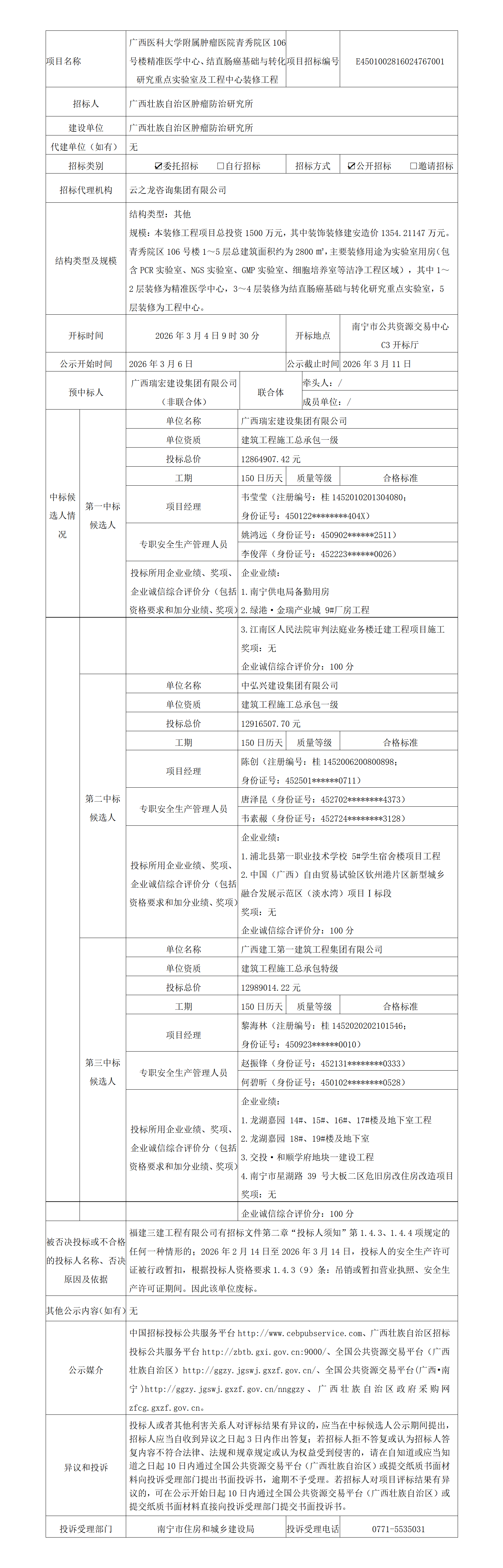 广西医科大学附属肿瘤医院青秀院区106号楼精准医学中心、结直肠癌基础与转化研究重点实验室及工程中心装修工程中标候选人公示
