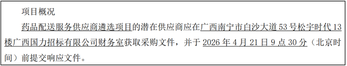 5.采购需求:拟遴选6家具有与药品经营规模和经营范围相适应的经营、仓储场所,具备冷链药品储备和配送条件药品配送的服务商。如需进一步了解详细内容,详见公开遴选文件。
