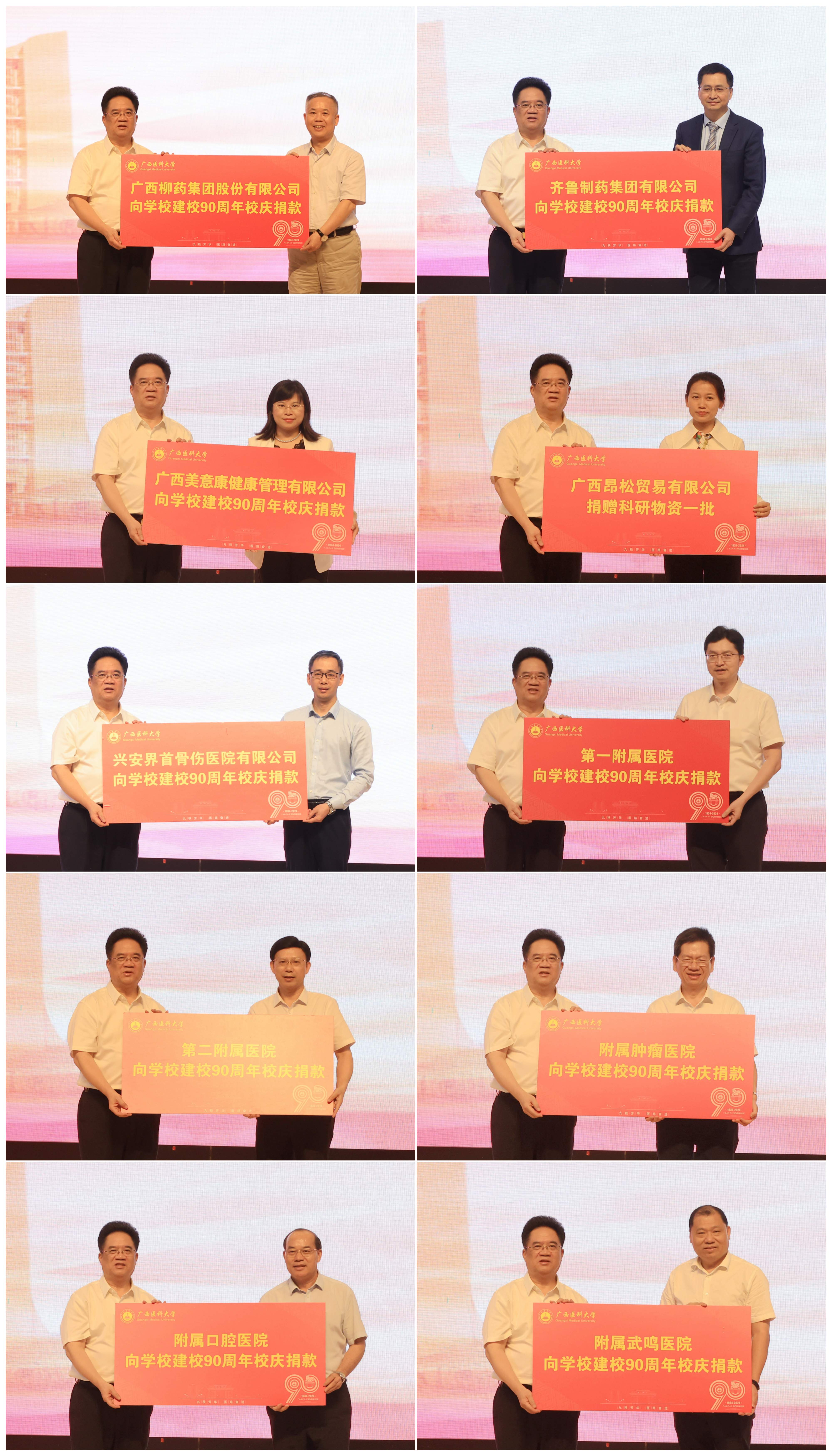 活动上启动了建校90周年校庆捐赠仪式,爱心企业、校友企业和校友、直属附属医院、校领导、非直属医院、各地市校友、学校处级干部共6批集体和个人代表上台捐赠。企业代表齐鲁制药集团副总经理吴刚先生就与学校的人才联合培养、科技创新、产学研用、公共服务等方面取得的良好成果和深厚情谊进行发言。学校创始人、首任校长戈绍龙的侄孙孙戈先生分享了戈绍龙老校长等医大先辈功勋的艰苦办学事迹,并捐赠了一批极有价值的戈老校长的著作、译作。