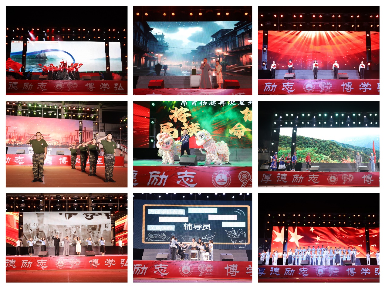晚会以献给母校的生日颂歌拉开帷幕,随后以“筚路蓝缕·铸梦起航”“栉风沐雨·砥砺前行”“春华秋实·永续华章”三大篇章依次铺开。职工合唱的《我们都是追梦人》《歌唱祖国》用跃动的音符表达着职工心怀祖国、筑梦教育的初心。学生合唱的《路+祖国不会忘记》彰显了校区学子的青春风采和“小我”融入“大我”的家国情怀。各党支部倾情上演的情景剧《永不消逝的电波》《矢志追求真理,再造青春中华》等演出了校区师生在党的领导下不辱使命、勇于担当、不负韶华、成就伟业的辉煌一生。歌舞《一起向未来》《华夏》跳出了校区学子心怀炽热、逐梦前行的青春活力,朗诵《今天我想对你说》诵出校区学子对母校的深情告白。
