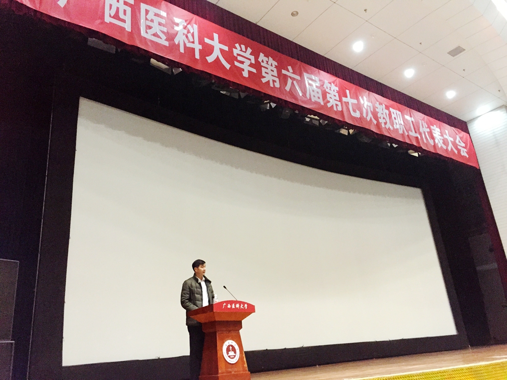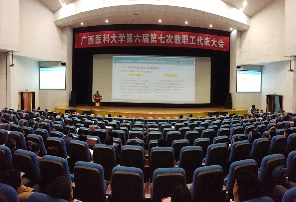 2015年1月22日下午,广西医科大学第六届第七次教职工代表大会在学校演讲厅召开。会议听取学校关于合作筹建广西医科大学玉林校区、平果校区工作报告,并对相关合作办学协议进行讨论和表决。会议应到代表290人,实到代表215人,达到开会要求。