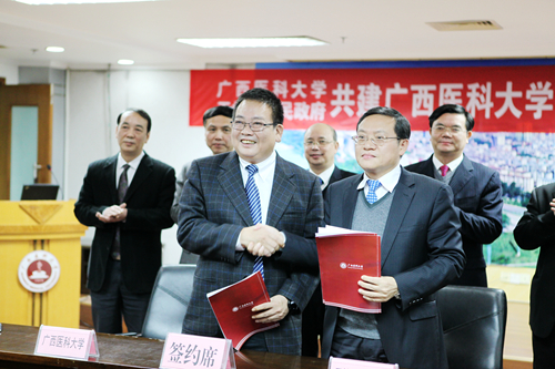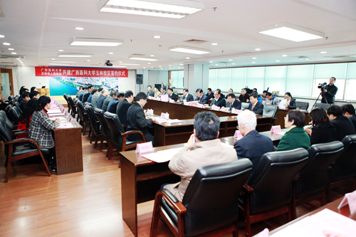 2016年1月15日下午,广西医科大学与玉林市人民政府共建广西医科大学玉林校区合作办学协议书签约仪式在综合楼14楼会议室举行。自治区教育厅蔡昌卓副厅长、高教处赵益真处长,玉林市政府苏海棠市长,玉林市委常委、宣传部长、副市长满昌学,市政府副秘书长、办公室主任李岗,玉林市发改委、教育局、财政局、卫计委、医疗集团负责人,我校仇小强书记、赵劲民校长等全体校领导,以及各职能部门、二级学院负责人、教代会和离退休老同志代表共同见证签约仪式。签约仪式由唐安洲副校长主持。