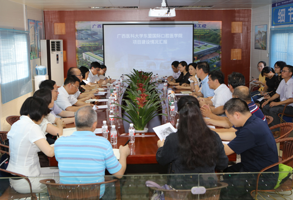 2018年5月23日上午,自治区卫生计生委主任、党组书记廖品琥等一行到广西医科大学东盟国际口腔医学院项目地实地考察调研并召开座谈会。广西医科大学副校长周诺,口腔医院党委书记罗萍、副院长邝海、副院长农晓琳、副院长卢小玲及建设办相关负责人一同参加了调研。