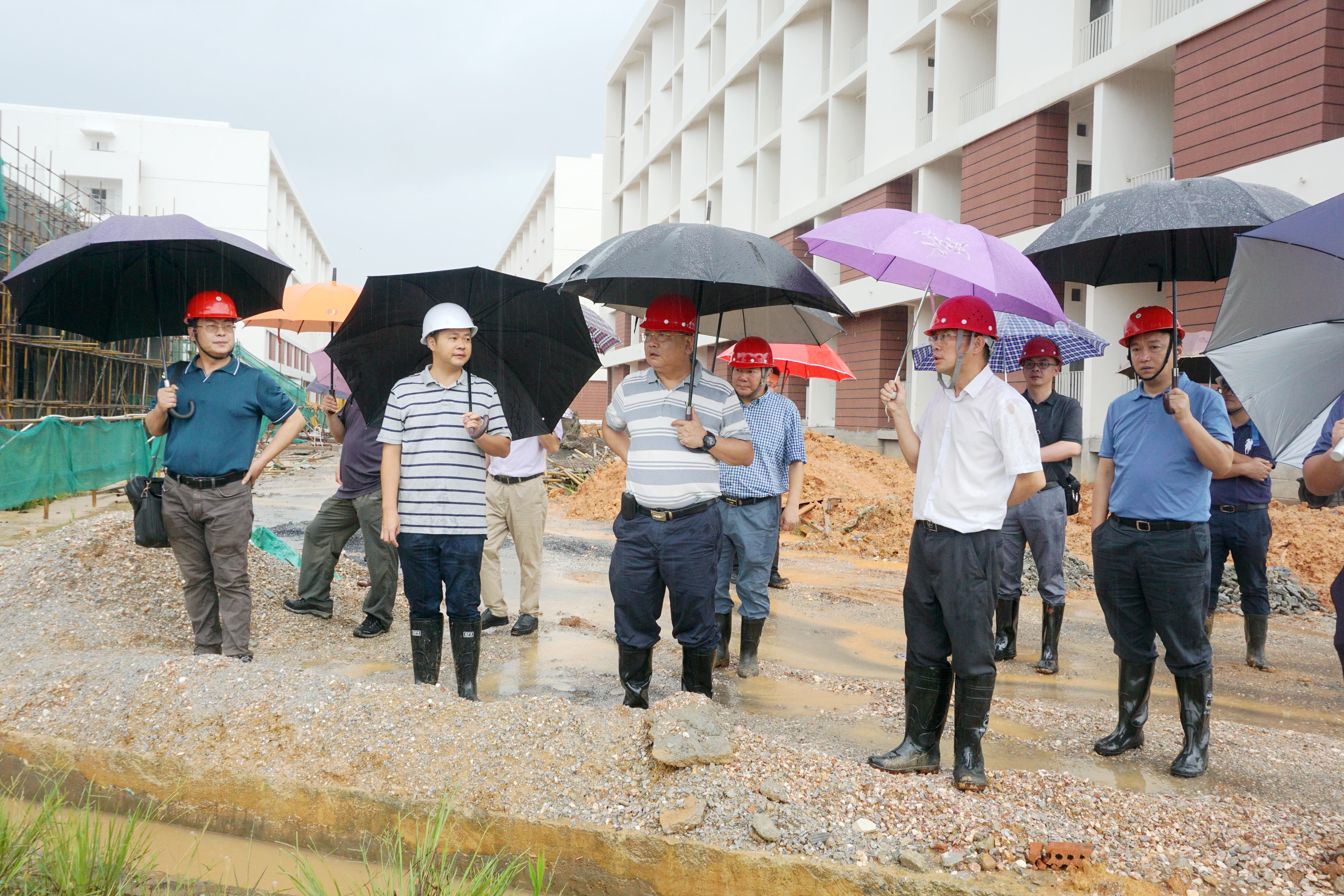 赵劲民校长一行冒着大雨深入A1主教学楼、B3学生宿舍楼、A4教学实验楼、A6食堂查看智慧教室、学生宿舍、实验室和食堂的建设和设备安装情况,随后召开现场办公会,对设计方、施工方、武鸣校区建设办、武鸣校区管理办和学校其他职能部门提出了工作要求。赵劲民校长强调,各部门要认识到武鸣校区建设的重要性和紧迫性,克服困难,全力推进武鸣校区建设工作,确保9月份顺利招生入驻。